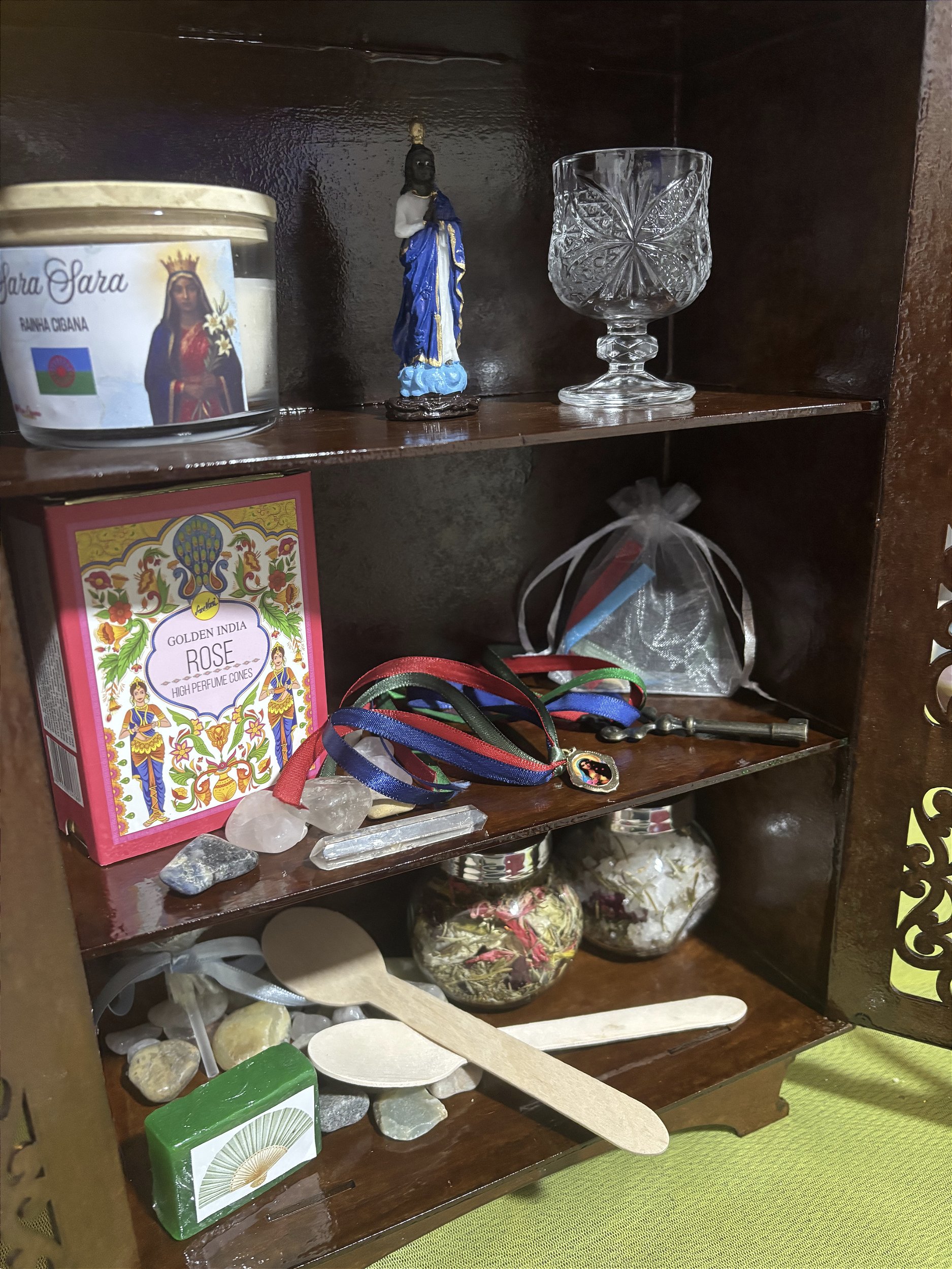 Relicário Encantado, feito e consagrado no Templo da Caravana de Luz. Inclui: movel de Mdf, no tamanho 38x26x13, com três estantes. Inclui:
