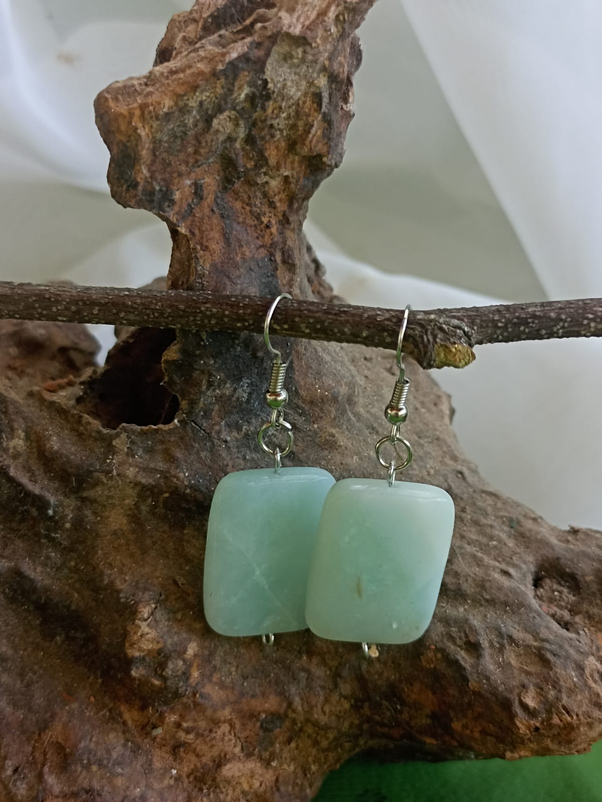 Brinco confeccionado Amazonita Lapidada, facetada. Cristal de alta qualidade, brinco em comprimento total de 9 cm. Acabamento em prateado.