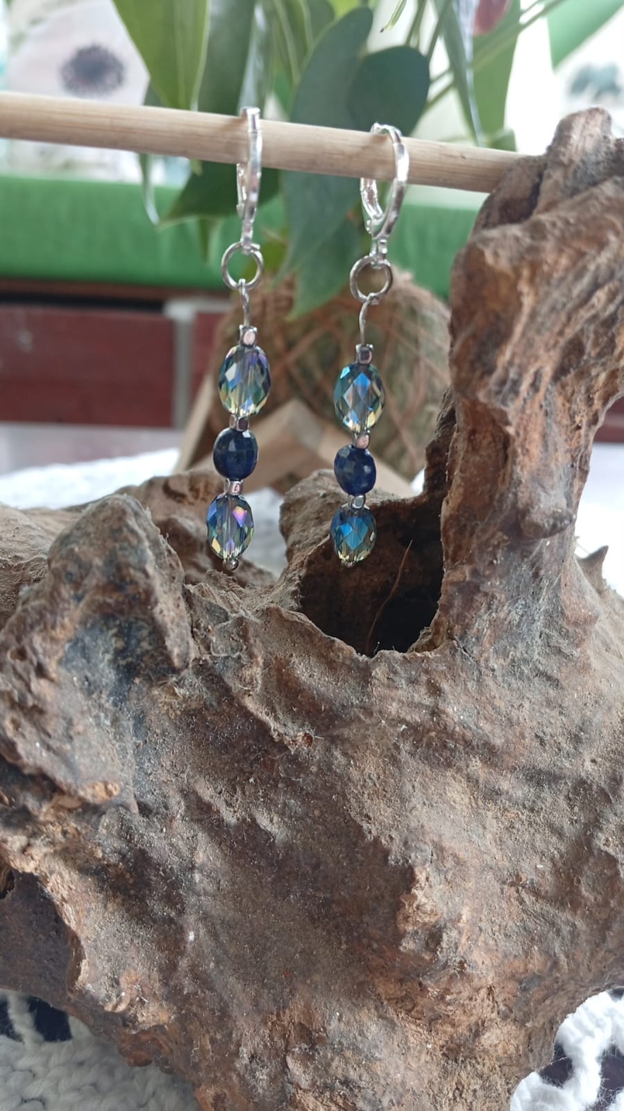 Este brinco combina lápis lazúli com cristais áurea irizados, oferecendo elegância com toque delicado. É ideal para quem busca acessórios que realcem o visual com pedras naturais e brilho especial.
