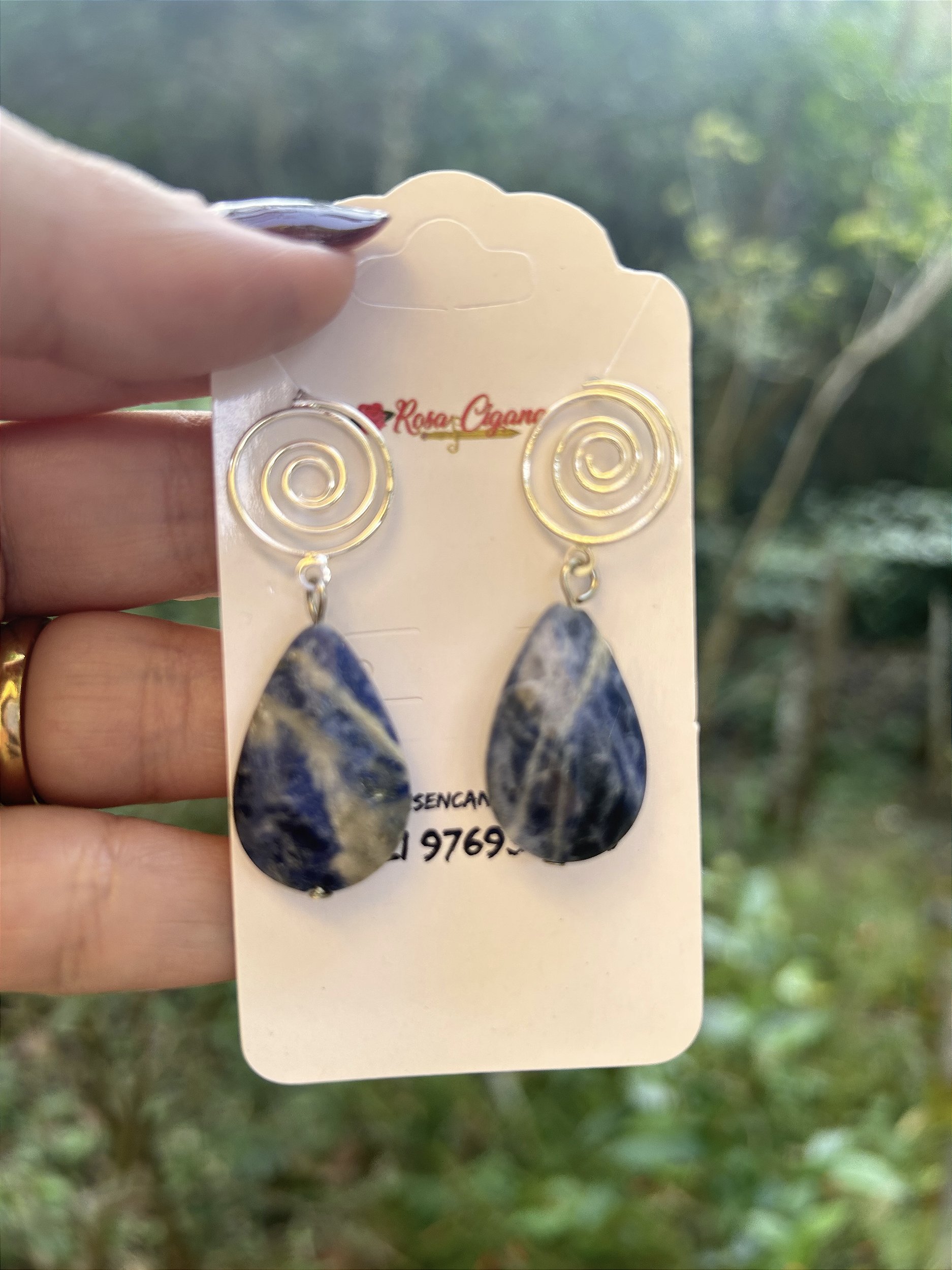 Brinco confeccionado em Sodalita Lapidada, facetada, em formato de gota.. Cristal de alta qualidade, brinco em comprimento total de 6 cm. Acabamento em prateado, com belo formato de espiral.