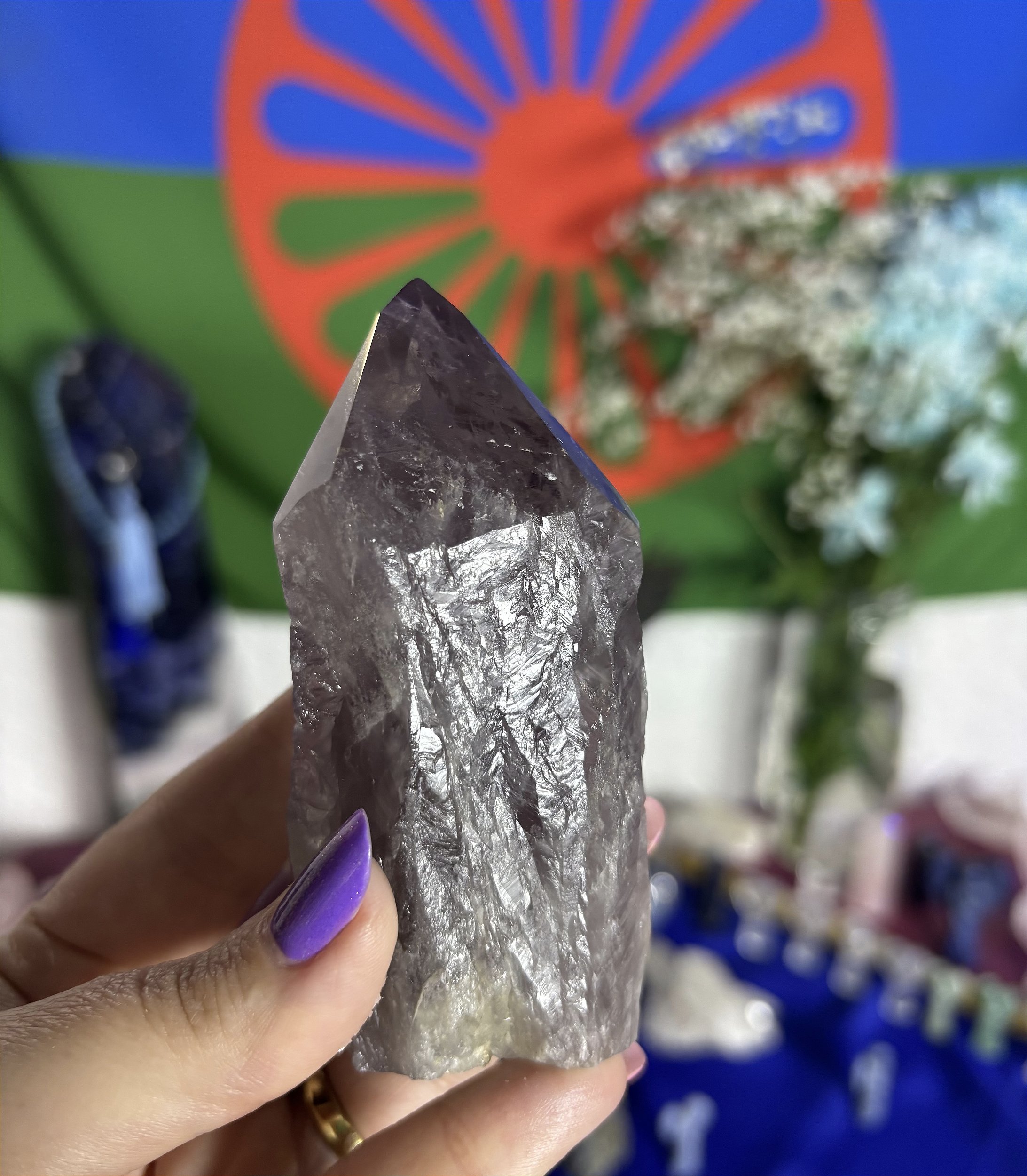 Ametista em formato de ponta, na base serrada. Fica em pé. Perfeita para seu Altar Cigano é para conexão com o Baralho.