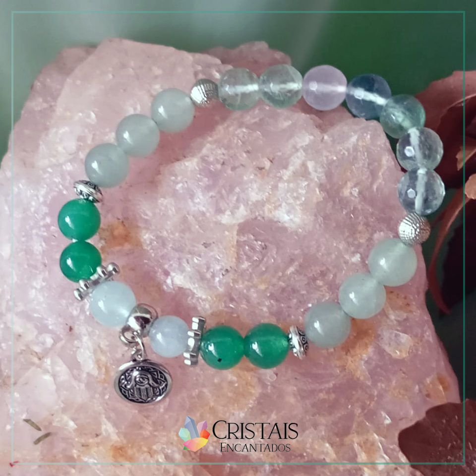 Pulseira confeccionada com contas 8mm quartzo verde, fluorita ,água marinha . Pingente mão de hamsá.
