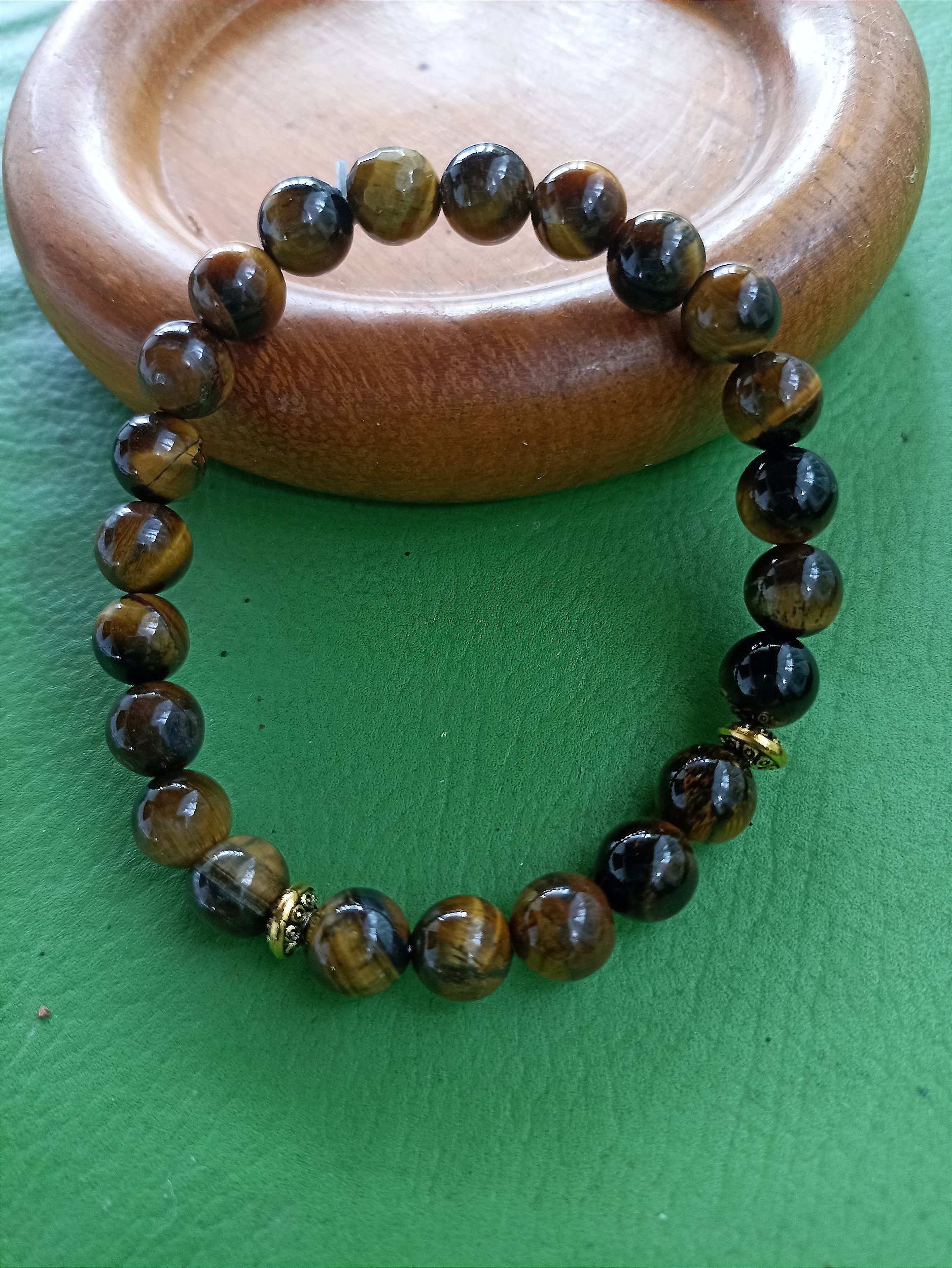 Pulseira destinada ao público masculino. Confeccionada com esferas 8 mm de olho de trigre, com acabamento em dourado. Elegância e proteção.