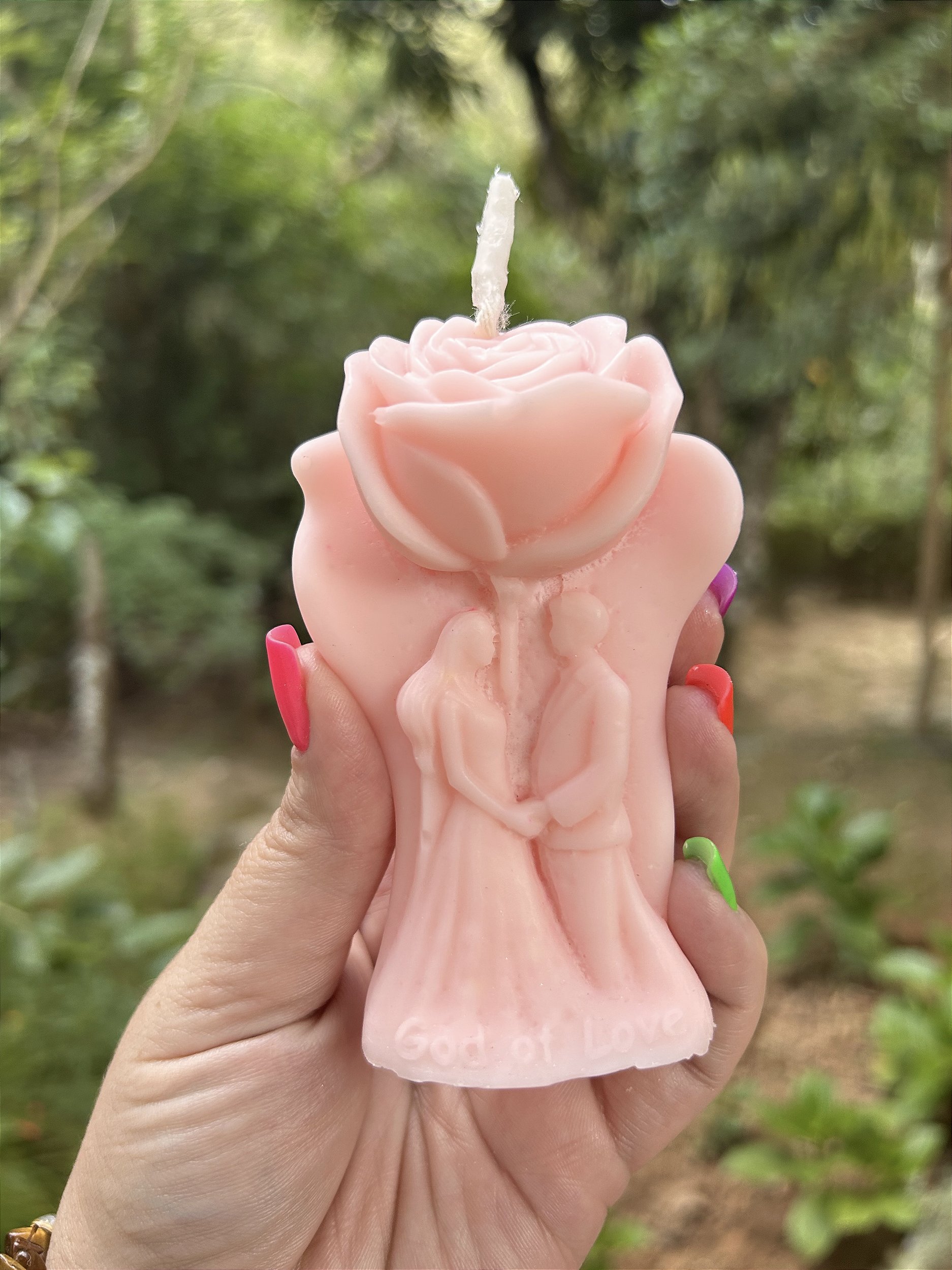 Vela de 80g em formato de casal e flor, aroma de baunilha. Feita com cera vegetal, vegana, com uma linda queima. Consagrada com as Ciganas do Amor para atrair e harmonizar o relacionamento.